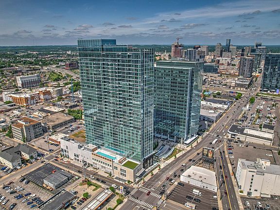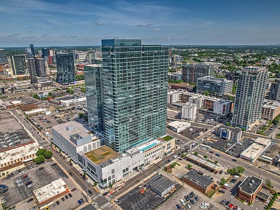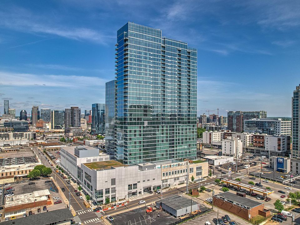 Residences at Broadwest 27th-floor skyline views. Modern open layout with W/D and garage parking in a full-service tower. Building amenities include a 34th-floor resort-style pool & sun terrace, fitness with steam/sauna, golf simulator, library & private conference room, private dining, billiards, lounge/bar, and outdoor green terrace with fire table, gaming lawn & grills; plus 24/7 reception, package services (incl. cold-storage), lobby coffee bar, conference rooms, and Conrad Nashville hospitality services (select services fee-based). Prime Midtown location near Vanderbilt, Centennial Park & Music Row.