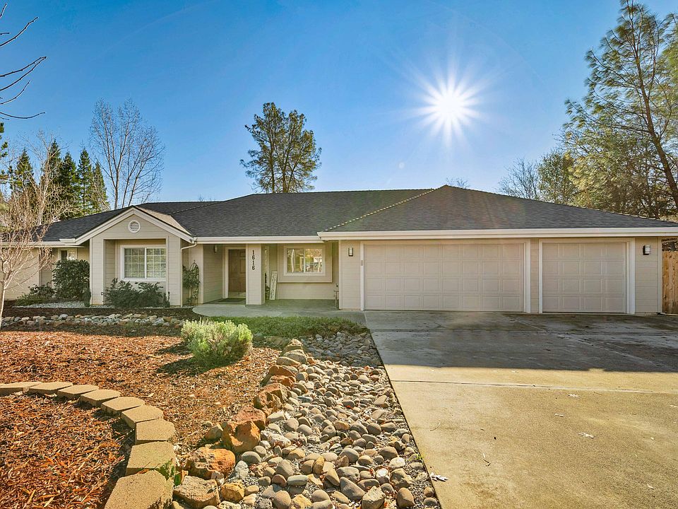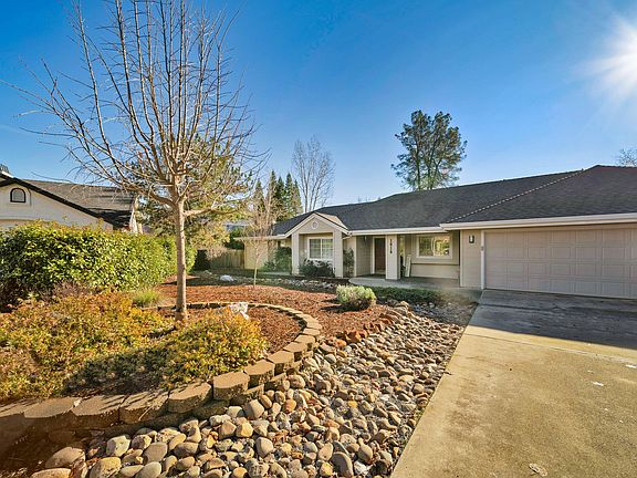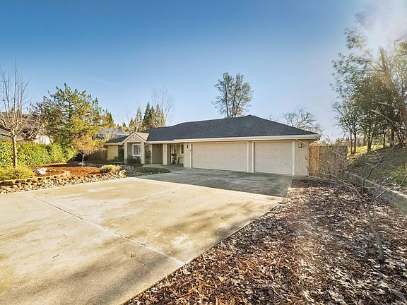 Beautiful & Loved Gold Hills Home! 3 bedrooms, 3 full bathrooms, large living room with cathedral ceilings and fireplace, adjoining dining area and kitchen provides a pleasant open space for family and friends. Bright kitchen with many new appliances and re-stained cabinets, indoor laundry, great sized bedrooms, amazing primary bedroom with remodeled gorgeous ensuite bathroom and walk-in closet, TONS of storage throughout home! 3rd bedroom is split from the other two with a full bathroom nearby- perfect for an adult child or in-law. With views of the golf course and distant trees it feels almost like a home in the country, yet boasts all the amenities of a friendly subdivision. Large lot with a mature and well maintained garden, you reap the benefits of a wonderful gardeners labor! An array of flowering plants and trees provide color most of the year, and an irrigated raised bed garden can supply the family with fresh fruits and vegetables. PAID OFF SOLAR, affordable living on a large lot, at the end of a cul-de sac. 3 car finished garage and plenty of street and driveway parking for hosting. Move-in ready!