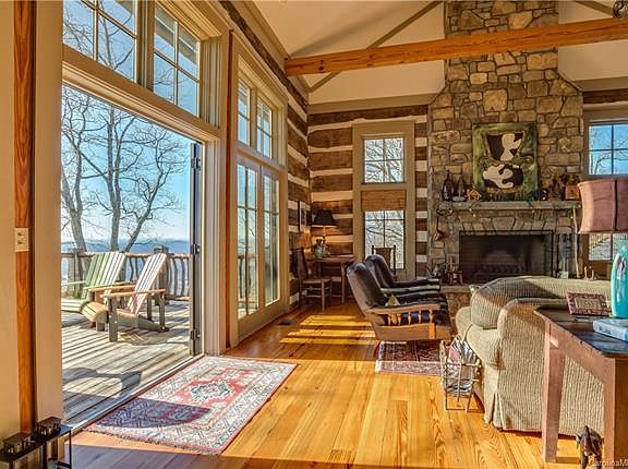Bespoke Luxury on the Mountain. Hawk's View, a sanctuary on top of the world.. this handcrafted stone & log home is the quintessential mountain retreat. Sure to soothe the soul and ensure you forget your worries down below. $900,000 to build, an incredible value.. Main level with beautiful chef's kitchen, two story great room w/ stone fireplace, butler's pantry, grilling deck. Upper deck offers plenty of space to unwind next to outdoor fireplace, lounge w/ a good book or dine al fresco under the Carolina sky as lights flitter in the distance. Upstairs offers a Master Suite w/ a view + guest suite. Lower level contains a bunk room, an office/Yoga/4th Bedroom, Full bath, game area and a lower den. There's another expansive deck to kick back in the hot tub and take in the hawk's soaring. Walk to impressive waterfall above and enjoy HOA amenities on top of mountain: swimming lakes & picnic area. 45 Mins to GVL - 50 Mins to ASH - 1:10 to CLT - 20 Mins to TIEC