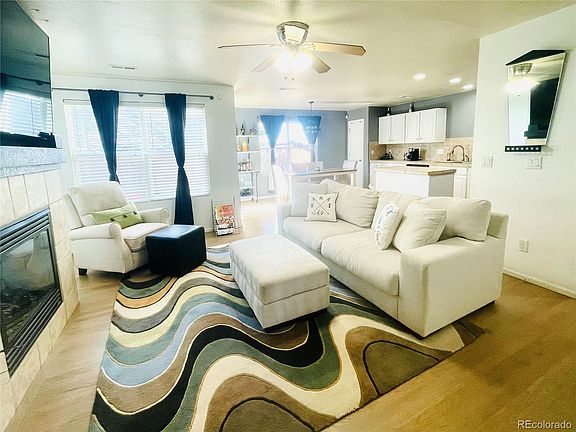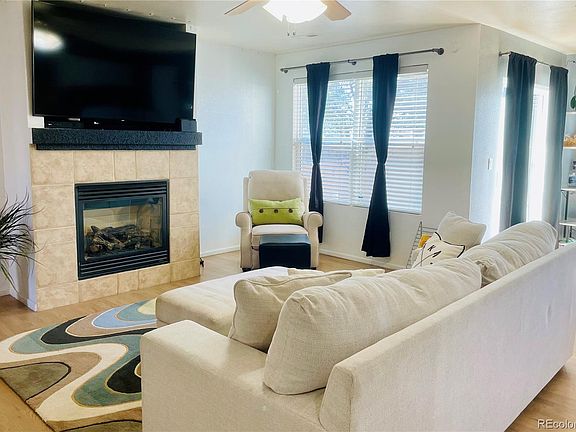 Welcome to beautiful Southcreek in the Cherry Creek School District. Sought after 3 bedrooms up, 2 1/2 baths and an attached 2 car garage. Main floor has high ceilings, large windows, wood floors and fireplace. Step out and enjoy the custom patio with pavers and fully fenced yard w/auto sprinkler. The large kitchen with island is perfect for everyday meals and entertaining too. Tons of cabinets, a pantry and upscale two year new appliances. Dining area very spacious and open. Three bedrooms up including the Primary BR with a walk-in closet, full bath and views of Cherry Creek Park. Convenient upstairs laundry room with Samsung washer and dryer. Brand new roof and gutters have just been installed with siding repairs and replacement to be scheduled soon. Seller has paid the Special Assessment in full for damage due to the 2023 hail storm in the area.