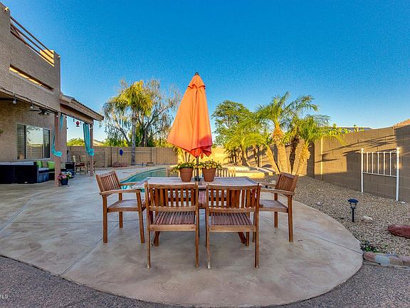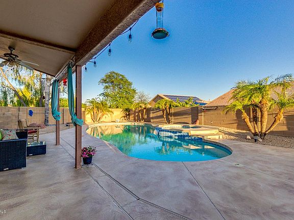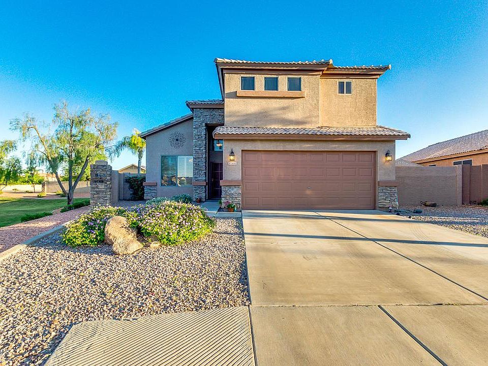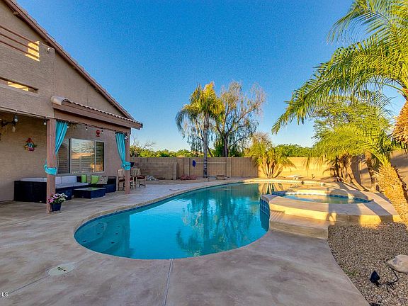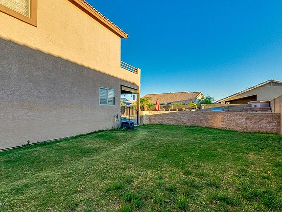 Large, corner lot next to a greenbelt. Two story home at Mountain Vista Ranch in Surprise with a main floor bedroom! This beautiful 2166 Sq Ft 4 bed/3 bath home boasts soaring ceilings and warm wood flooring. Gorgeous kitchen complete with breakfast bar, RO System, ample counter space and a dining area overlooking the sparkling pool/spa. Master suite has plush carpet with ceiling fan and balcony that gives great views of the mountains. Full bathroom/dual sink vanity. Spacious walk in closet! The two upstairs bedrooms share a roomy Jack and Jill bathroom. Backyard is ready for entertaining with a covered patio/ custom pool/spa and built in barbecue and fireplace with plenty of built in seating and plush vegetation. Handyman shed is equipped with electric. Many added features for pet owners.