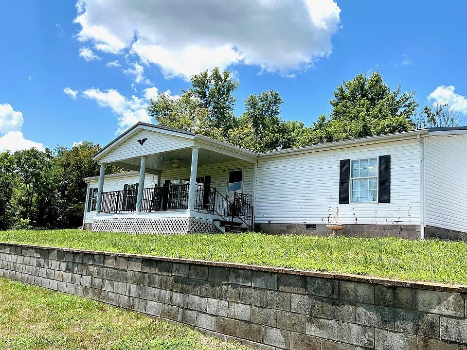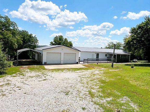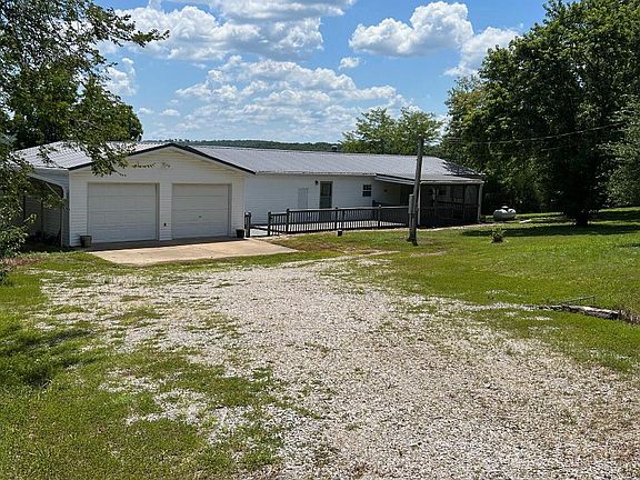 Location Location Location! And these views..WOW! This immaculate move in ready home is just minutes from Bull Shoals Lake, 2 minutes from Bear Creek and only about 40 minutes from Branson. The split floor plan is perfect for families. There is a primary ensuite on one end with a bathroom and closet big enough to live in. The remaining two bedrooms and bathroom are on the other end. The kitchen/dining room flows well and has a brand new refrigerator and microwave that will convey with the property. If you enjoy outdoor space, there are two covered porches to choose from. This doublewide sits on a permanent foundation, has a metal roof, 2 car detached garage, 2 carports, one singe and one double and a 10 x 12 storage shed. All of this on 6.69 acres. This one is a must see. Sell AS IS.