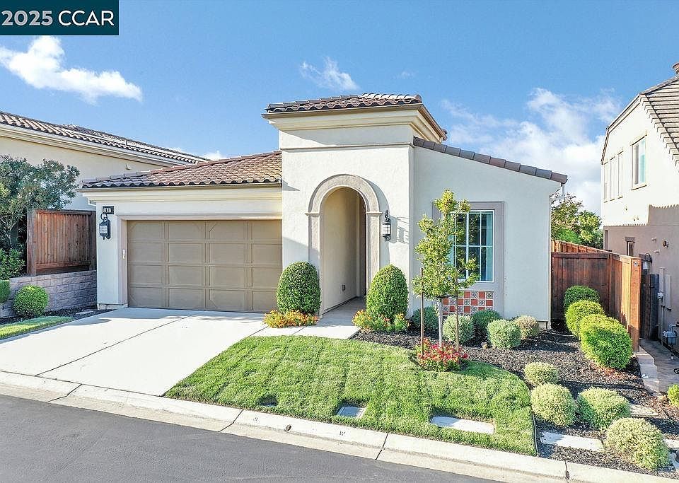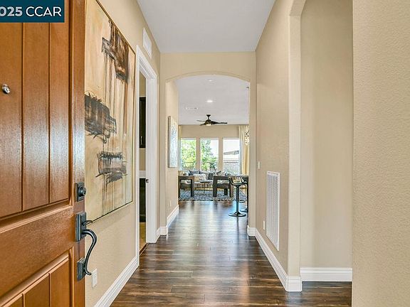 Come Join the Finest 55+ Resort Living the Bay Area has to offer at Trilogy Vineyards! Exclusive Clubhouse with indoor & outdoor pools, cabanas, full service gym & spa, and activities galore: Tennis, Pickleball, Bocce Ball, Wine Barn, Field Trips, Dance Classes and packed Social Calendar. Enjoy the full service restaurant and cafe along with regular family and holiday dining events. Several local Golf Courses & Country Clubs are within a 10-15 min drive. Waltz into this Move-in-Ready Navarra Model a Spanish style home that boasts over $60,000 in upgrades: 2 bed 2 bath with an additional flexible space. Stunning hardwood floors throughout, light and bright kitchen features gorgeous granite counters, custom backsplash, island panelling, which accents the dark wood cabinets & stainless appliances. LED lighting throughout. Spacious living area with stacked stone great room wall, large primary suite with custom closet by Closet World w/ quartzite bathroom vanity with tile shower. 10’ ceilings add to the airy feel and the well designed flex room provides generous laundry and storage plus serves as a home office with a large built-in desk with laterals. Solid travertine patio pavers and sun sail shade to keep things cool. Located on a quiet lane across from a park and no rear neighbors.