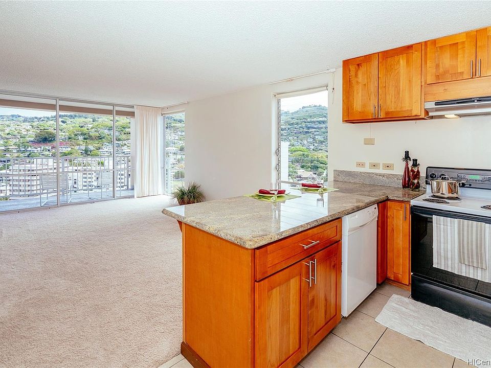 Bright, breezy, and a beautiful corner unit! Upgraded kitchen with new cabinets and granite counters. Centrally located near Makiki Park, close to shopping, to work, and schools. Two bedrooms with Jack and Jill shower. Full size washer and dryer in the unit, assigned covered parking. Tropical pool area, open air lobby, beautiful grounds, bike racks, secured storage lockers, keyed elevator. A great place to live. This end unit has an extra window for lots of natural light and cool mountain breezes. Excellent building (won the National Building of the Year award in 2017).