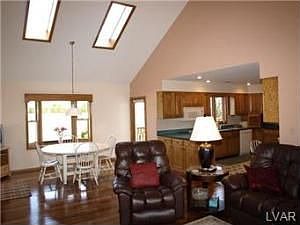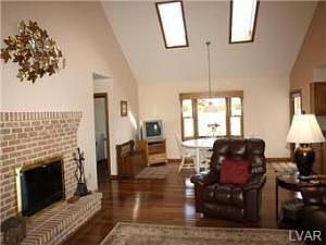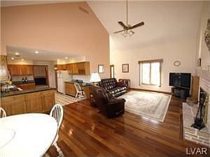 The best of all worlds comes together in this special home with open space inside and out. Soaring ceilings, Brazilian Teak hardwood floors, recently renovated kitchen with Corian countertops, attached oversize 3-car garage. Plus a first-floor great room with fireplace, breakfast area with bay window, and dining room. The living room/study features a built-in oak bookcase. Completing the convenience is a first-floor master bedroom with full bath and walk-in closet. Upstairs are 2 large bedrooms with generous closets and a full bath. Bonus -- a coal stove in the basement and a new one-car garage/shed. The large landscaped yard is appointed with colorful maples, firs and perennials. Enjoy them all from the oversize deck. This special home has many recent upgrades, including the roof, heat pump & humidifier, water heater and water softener. With a central vac it's just what you're looking for -- great design, beautiful acre, and one easy mile to I-78. Attractively priced at $325,000.