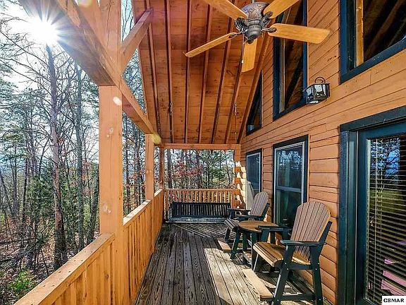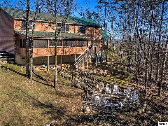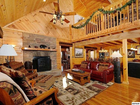 LUXURY AT ITS FINEST! THIS 4BR/4BA CUSTOM TRUE LOG LODGE SITTING ON TWO SPACIOUS LOTS (0.72AC )WITH A NICE USEABLE YARD, FIREPIT, ETC. FEAT. BONUS ROOM WITH SPECTACULAR VIEWS, FULLY FURNISHED, AND INCOME PRODUCING IS WAITNG FOR YOU! Professionally decorated and furnished with custom log beds, fixtures, cabinets, and furnishings throughout. The interior of the home is very open and airy with lots of light, cathedral ceilings with walls of fixed glass, two living rooms on main level both with massive stone fireplace, and one with pool table and air hockey, and a great room on the second level for entertaining. Eat in kitchen and dining room with plenty of space for gatherings. Custom cabinets and fully equipped. Master Suite with jet tub. Covered wraparound porch with screened in porch on back w/ hot tub and seating area. Ample parking and room to build garage/workshop. Hardwood flooring throughout with wood walls and beams. This is a very unique cabin that is a showplace! Must see to believe the luxurious feel this cabin has to offer!