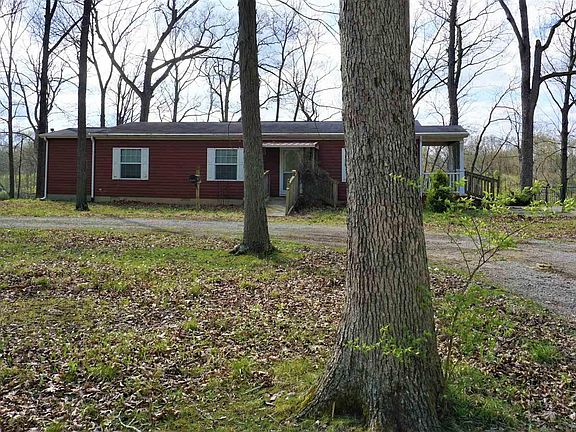 Beautiful view of Raccoon Lake from the living room or concrete patio area. Wooded lot with a 3 bedroom, 2 bathroom manufactured home with a shelter room addition. Outside you will find a garage, sheds and a great place to relax. There is a lot to offer here for the price!