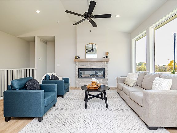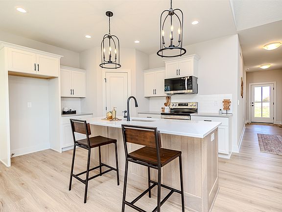 Welcome to the KRM Custom Homes 3-bedroom Amber plan nestled in the charming Blooming Heights South neighborhood. Explore this exquisite home boasting 3 bedrooms on the main floor, with a great room adorned with an electric fireplace and large fixed windows for ample natural light. The kitchen showcases gorgeous quartz countertops, a spacious walk-in pantry, and an expansive kitchen is equipped with a stove, microwave, and dishwasher. The primary suite offers a private bath with a tiled shower and a sleek frameless glass door. Additionally, the primary closet conveniently connects to the laundry room. The drop zone provides a perfect spot to organize essentials for a quick exit. More space to love in the finished walkout lower level! Two additional bedrooms, large family room, and a full bathroom provide you with more space for living and entertaining. Exclusive builder features include the BIBS system, city water meter, passive radon mitigation, Form-a-Drain, Advantek subflooring, and the Zip system on the exterior.