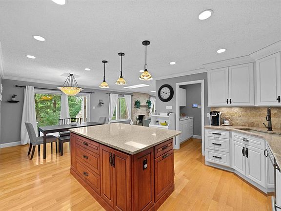 stone backsplash, gas cooktop, & copper range hood. Kitchen opens to your breakfast room and family room that boasts gas fireplace w/stone and ample light through the skylights. Spacious Master bedroom w/ large walk-in closet and tastefully updated Luxury Master bath with Updated Vanity w / granite tops and oil rub bronze fixtures. Two large bedrooms, fully updated hall bath and main floor laundry finish off the first floor. Step out to a beautiful private outdoor space that features a large covered patio and a stone fireplace that will make evenings in the yard wonderful. Full basement ready for your finishes!