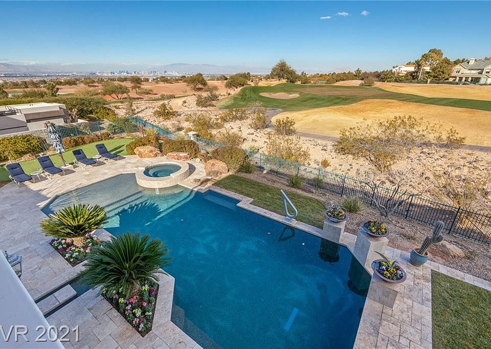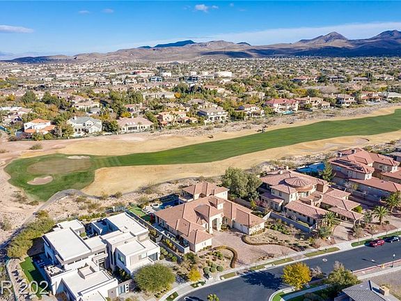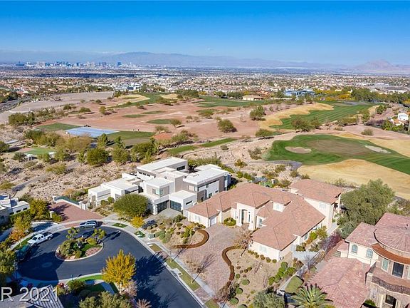 Live the ultimate desert lifestyle at this stately home perfectly positioned at the end of a private cul-de-sac with Strip Views This classic-contemporary estate offers world-class design and exceptional features and amenities. Take in unobstructed views of the pool area and golf course from the living room which boasts a large, contemporary fireplace with a floor to ceiling "teakwood" marble surround. The kitchen, family room and informal dining areas feature Versailles pattern bone travertine with 10' glass sliding/pocket doors that lead seamlessly to the outdoor entertainment area. The sprawling master bedroom suite includes "His" and "Hers" amenities, open views to the golf course and four large closets. Kitchen includes Viking Professional series appliances and two dishwashers. All rooms are conveniently located on the main floor with the exception of the card/game room and 4th bedroom suite with large open balcony with great Strip Views.