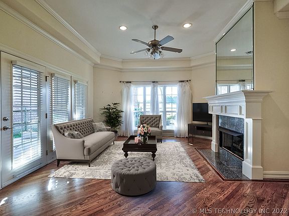 Beautiful 1 story home located in Broken Arrow's highly sought after Gated Golf Community, Magnolia Gardens at Battle Creek. Large private patio with golf course view. Gorgeous hardwood floors thru-out. Granite kitchen with Island and Large Formal dining, Stunning Crown Molding, 10 ft ceilings. Living has fireplace with gas logs. Split bedroom plan, Master with extensive walk in closet, oversized shower with low profile entrance and double shower heads. Inside Safe Room with 1/2 bath. Home is wheel chair accessible.