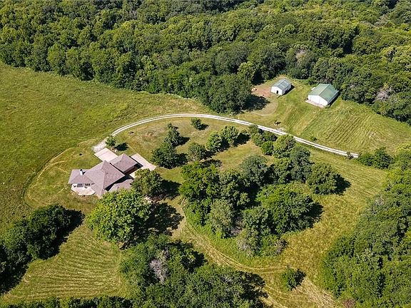Amazing custom-built contemporary home. A secluded retreat on 71 acres of beautiful wooded land with pond and pastures, ready for horses, 4 wheelers and your lifestyle! Close-in, 20 miles to Liberty and 6 miles to Excelsior Springs yet offering the privacy of country living. Enjoy abundant wildlife from a covered patio with a stainless steel wood burning fireplace. This beautiful 1 1/2 story home with open floor plan features 3+ bedrooms and