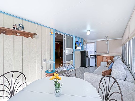 Are you wanting a well-kept home with recent renovations only minutes to the beach? This furnished home comes with 1 bed/ 1 bath and is in great condition with recently updated NEW vinyl & laminate flooring and subflooring throughout, giving it a modern look. The kitchen includes oven/range and fridge. The OPEN CONCEPT kitchen overlooks the living room and dining room area. The bedroom is very spacious, comfy and has an En-suite bathroom. Other features include smoke alarms, ceiling fans and built-in cabinets. LOTS OF STORAGE SPACE! The enclosed Florida room offers lots of extra space, a stand-up A/C unit, an extra fridge as well as offering lots of natural lighting with all glass sliding windows to brighten your day, so what else can you ask for?! But that's not it! Other recent renovations are the electric throughout home and renovated Cental A/C and heating unit!! The exterior siding is made of sturdy vinyl and once outside it can make for a great patio area to enjoy the warm evenings as well as watching the sunrise from your front porch. With its beautiful native landscaping, plenty of parking and only 4 miles from the beach, don't miss out on this affordable opportunity and come see this home for yourself! This ALL-AGED community accepts most dogs and has lots of amenities including swimming pools, activities and more! Come see it for yourself!