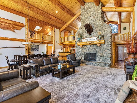 This grand log-framed estate on 4.26 acres is just minutes from downtown Sisters and is considered the premier lot in the subdivision. Surrounded by Ponderosa pines for exceptional privacy, the home showcases lodge-style craftsmanship throughout. Features include a chef's kitchen, two-story great room with river rock fireplace, and main-level primary suite. A spacious finished bonus room with full bath sits above the garage. Two guest bedrooms downstairs share a Jack & Jill bath. Enjoy zoned radiant floor heating and A/C for year-round comfort. A gated driveway leads to a 3,000± sq. ft. outbuilding with two large storage bays, a heated indoor pool, oversized hot tub (both with retractable covers), and a large craft room. The fully fenced property offers equestrian potential, a pond with dock, gazebo, in-ground propane tank, irrigation rights, and forest tax deferral. A truly rare find combining privacy, luxury, and Central Oregon charm.