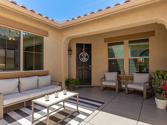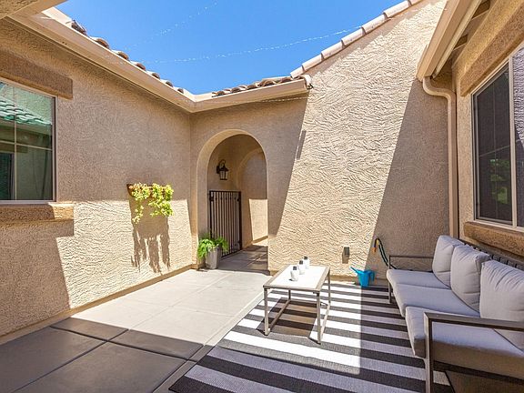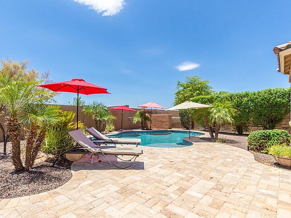 Great curb appeal with mature shade trees and inviting front courtyard. Enter to a formal living room/den. Spacious open floor plan for the kitchen, dining and family room. Soft color palette and diagonally tiled floors. The eat-in kitchen has custom espresso cabinets, beautiful granite counters, island w/breakfast bar, electric cook top, wall mount double ovens & microwave, walk-in pantry and buffet counter in dining area. Inside laundry. home office. Master has private entrance, sitting area and full bath that includes a split double vanity, soaking tub, separate shower and walk-in closet. Generous sized secondary bedrooms. The gorgeous backyard has a covered patio, brick paver extended patio/conversation area, sparkling heated pool. Owned Solar Panels. Easy access to shopping & the I-10