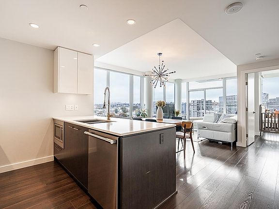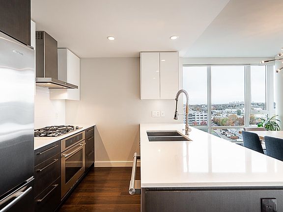 Podium-level corner 2bed/2bath + den unit at Central w/ an abundance of natural light & expansive east & south views, A/C & large patio ideal for entertaining. Unit backs onto rooftop terrace common area, extending your outdoor space. Spacious layout fits full-size dining table, 4 stools at island, large primary (dbl sinks, walk-in shower), 2nd bath newly reno’d. Custom in-suite storage (den). High-end finishings incl. JennAir appls, gas cooktop, wrap-around windows, beautiful flooring. Building offers 7,000 sqft wellness centre: gym, yoga, party/theatre/dining rooms w/ pro kitchen, steam/sauna, rooftop garden. Steps to Olympic Village shops, SkyTrain, & Seawall. 1 pkg, 1 locker, 1 bike locker. Call for your private appointment easy to show! OH Sat. Nov. 22 1:00 - 2:30pm.