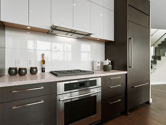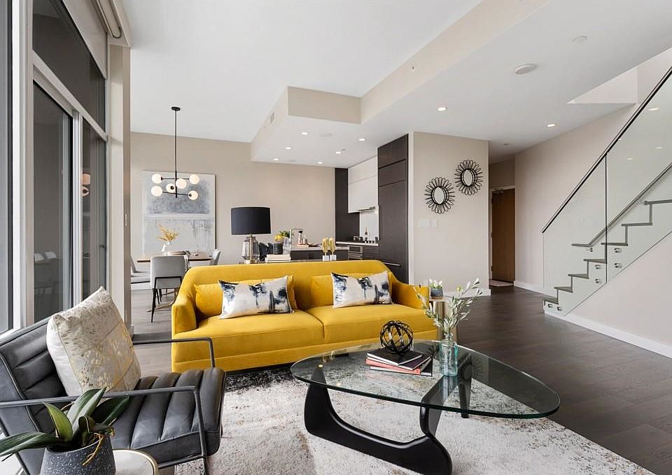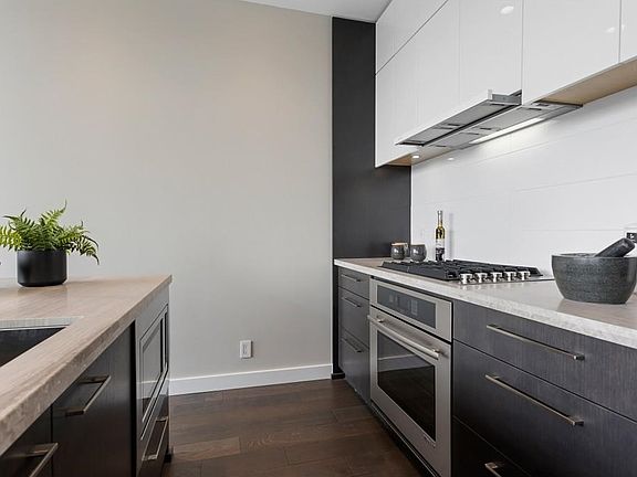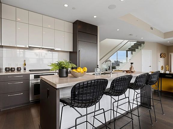 South facing 1367 sqft PENTHOUSE with expansive Views from every room, as well as from your private 531 sqft rooftop patio oasis. This 2 bed/2bath + flex space is flooded with natural light, has floor to ceiling windows and 10' ceilings. The gourmet kitchen features integrated appliances, a gas cooktop, a travertine island perfect for entertaining & is open to the spacious living/dining and second balcony. Beautiful oak floors throughout, natural stone countertops, A/C, automated roller shades & Control4 system for sound speakers/lighting, and with friendly 24/7 concierge, a first class fitness facility, media & meeting rooms; this well maintained building provides everything you could ask for. Complete with private 2 car enclosed garage and large storage locker. Location can't be beat!