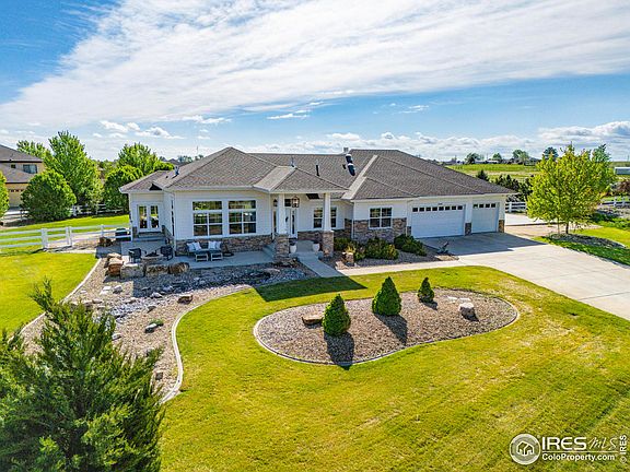 Offers due Sunday 5/19 by 11am! Nestled between Dacono and Thornton, just moments from Costco and the Larkridge Shopping Center, this exquisite ranch-style residence promises an unparalleled lifestyle. Take advantage of an exceptional opportunity by using our preferred lender to receive a 1% lender concession and complimentary refinancing, should rates decline in the coming months. This corner-lot marvel is strategically placed for both privacy and convenience. Spanning over an acre of meticulously landscaped grounds, the property boasts unobstructed mountain vistas from the front and backs to farm land with gorgeous horses in the back, elegant fountains and serene streams in both the front and back. The lush greenery, nourished by non-potable water from the HOA, includes a custom-built fire pit and a charming basketball court.Step inside to a world of refined elegance with an open floor plan that highlights a towering stone fireplace and a stunning kitchen adorned with white and gold hues, custom ceilings, and top-of-the-line appliances. The richness of the gorgeous hardwood floors and knotty alder doors flows throughout the home, creating a warm and inviting ambiance. The primary suite is a retreat of its own, featuring French doors, a recently updated double shower, an expansive walk-in closet, and a private doorway leading directly to the breathtaking backyard.The basement offers a vast canvas for personalization to meet your future needs. Meanwhile, car enthusiasts will revel in the oversized six-car garage (but due to installed shelving we are calling it a five car garage), thoughtfully equipped with 220v power, a washtub, heat, and even a urinal- it's perfect for those days when you're in the "doghouse" and not allowed inside. Experience the pinnacle of luxury living where every detail is crafted for elegance and comfort.