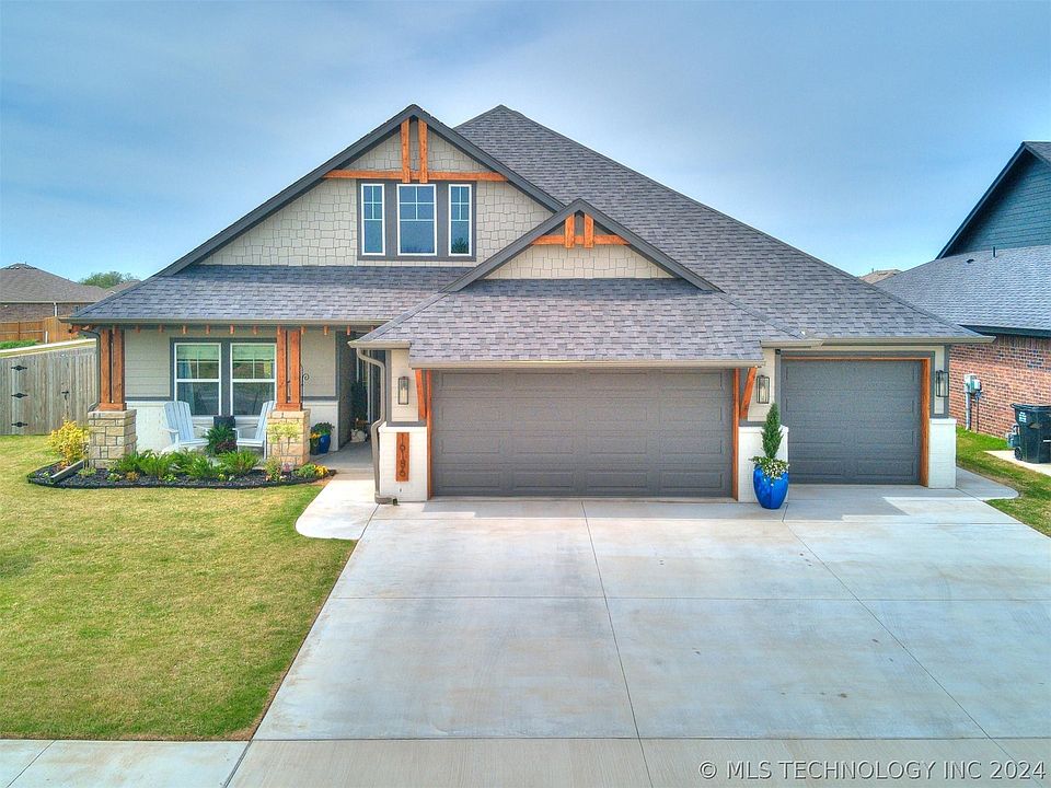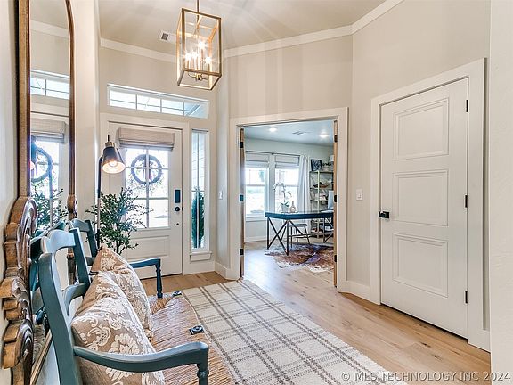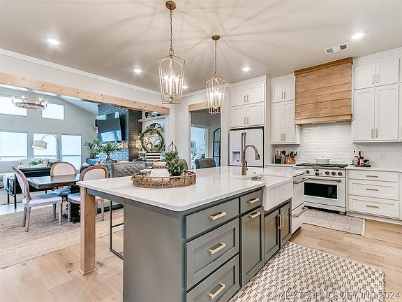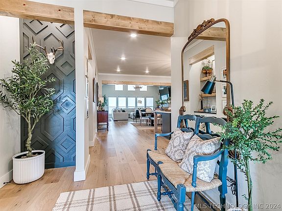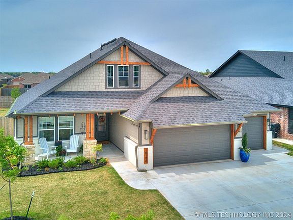 Builder’s Custom Home! Step into this charming home through a welcoming entryway that opens to the kitchen & living. The kitchen, boasts top-of-the-line Kitchen-Aid "Cafe" appliances, including a 36” 6-burner gas range & oven, additional electric wall oven, 2 dishwasher drawers, a French door fridge, and a convection microwave. The oversized island has quartz countertops with a farmhouse sink, and the walk-in pantry offers ample storage. The living room exudes warmth and character featuring cathedral ceilings with wooden beams & a charming gas fireplace with a distressed mantle. Enhancing the charm are floating shelves with painted shiplap accents. Retreat to the primary bedroom, boasting an en-suite bath with quartz countertop double vanities, a freestanding tub, and a spacious tiled shower. One of the secondary bedrooms has a built-in queen-sized Murphy bed, with versatility for guests or a multifunctional space. Tankless hot water enhances comfort and efficiency. Spacious and private home office. The back patio is an entertainer's dream with a spacious vaulted covered patio with a privacy wall, perfect for enjoying peaceful evenings by the fire pit! With amenities like a playground & splash pad, Bixby Village is the perfect place! Located across the street from the highly regarded Bixby Central Intermediate School and High School, the location could not be better for raising a family. Don't miss the opportunity to make it yours! The owner is a licensed real estate agent #171971.