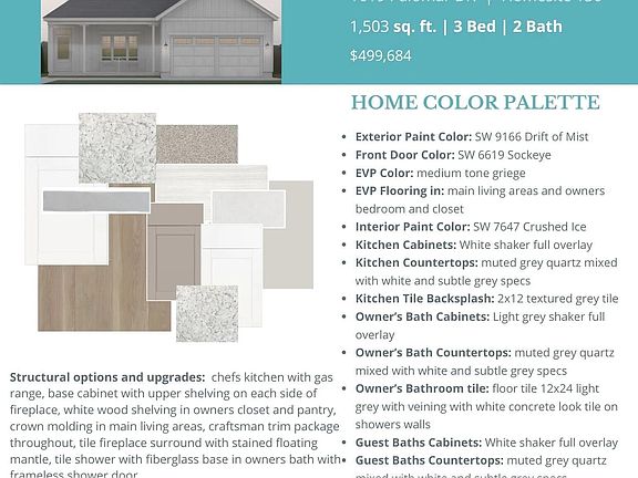 Bill Clark Homes' Jamestown Home Plan in the Coastal Elevation is splendid with 1503 sq. ft., 3 bedrooms and 2 bathrooms on one floor. Lots of upgrades grace this home including: a Chef's kitchen with gas range and cast iron undermount sink, under cabinet lighting, 42'' upper cabinets, angled corner cabinet, full depth cabinet with end panel over refrigerator, base cabinet with upper shelving on each side of the fireplace, white wood shelving in owners closet and pantry, crown molding in main living areas, craftsman trim package throughout, tile fireplace surround with stained floating mantle, tile shower with fiberglass base in owners bath with frameless shower door.