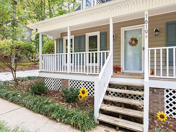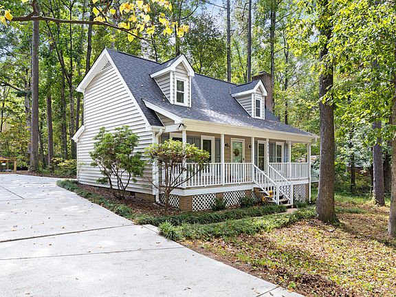 Goldilocks would fancy 1619 Rowemont as JUST right! Not too big but not too small, there really is a house available in this market that has it ALL. Classic cape cod curb appeal meets move-in-ready comfort in this charming home situated on an oversized wooded lot. Rocking chair front porch extends the full width of the home. Enjoy a cup of joe as you relax in your own personal oasis. Inside, you'll find a well-cared for home with new roof (2025), newer carpet, refreshed kitchen and baths (2024), a wood-burning fireplace, new HVAC and ductwork (2024), and so much more! The floor plan provides a first floor bedroom, which can be utilized as the primary bedroom or a guest room/office. Outside, relax on the back deck overlooking a large yard shaded by mature trees with a parmanent chicken coop. With the newly Whippoorwill Park just a short stroll away, this home offers the perfect blend of comfort, character, and community in one inviting package. 6 minutes to Costco, 9 minutes to 9th Street, and less than 20 min to RTP as well!