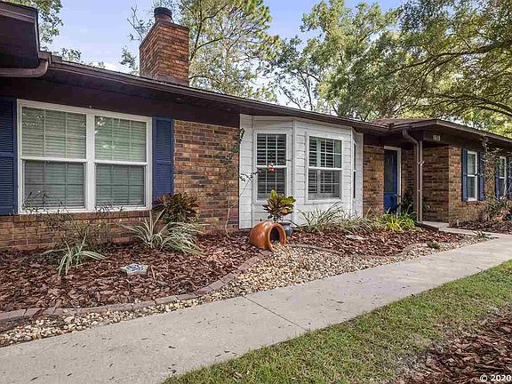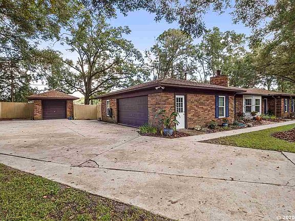 Welcome home to this all brick 4 bedroom/3 bath spacious home located on cul-de-sac with large fenced yard in Sunrise. This updated home boasts energy efficient Pella windows and skylights for plenty of natural light. Amazing split floorplan offers flexibility for a 1/1 in-law suite, along with flex space for work at home or school. Open kitchen featuring gas range, plenty of cabinets and built-in desk area overlooks the large dining area with French doors opening to additional flex space/sunroom. Master suite showcases beveled ceiling with 2 large closets with en suite bathroom and built-in sitting vanity. Oversized 2-car garage and detached single car garage/workshop is great for extra storage. Community offers playground and tennis court, great location to schools, UF, Shands, NFRMC, shopping & entertainment