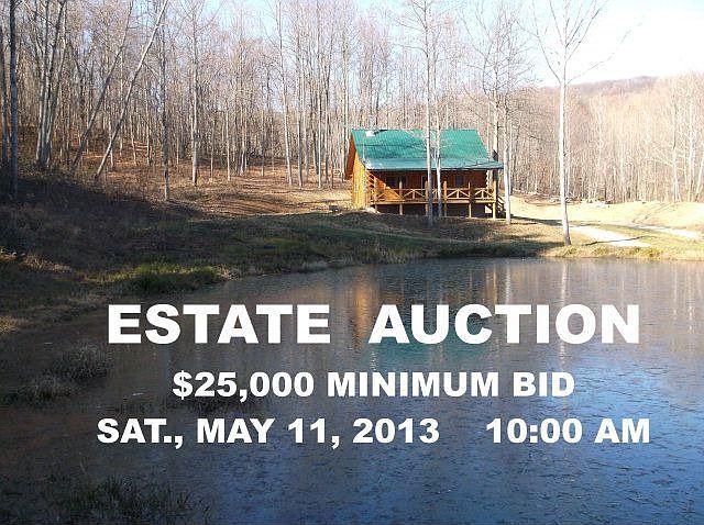 ESTATE AUCTION *25 ACRES * LOG CABIN * POND * POLE BARN *$25,000 Minimum Bid*Harley Davidson Motorcycle*3-Wheeled V8 Motorcycle1967 MERCURY Cyclone Car * Bus * Car Lift * Sat., May 11, 2013 * 10:00 AM REAL ESTATE SELLS FIRST Followed by Personal Property1619 Schmidt Road, Bainbridge, Ohio (Ross Co.) 45612. Being a secluded log cabin built in 2009, situated on a wooded hillside w/pond & pole barn below. Cabin has nice covered wood front porch overlooking scenic Paint Valley, stocked pond & pole barn. The cabin desigh: open kitchen-living rm combo w/wood burning flu; bedrm w/closet; full bath w/shower & utility hook-ups; loft offers potential for additional bedroom; metal roof will allow you to listen to the rain drops dancing in the wind; land comprised of pasture & woodland; nice pole barn is approx. 40 x 40 w/2 lean-tos approx. 20 x 40. This building has a concrete floor, huge sliding door plus additional horse tack room w/electric service & septic tank.