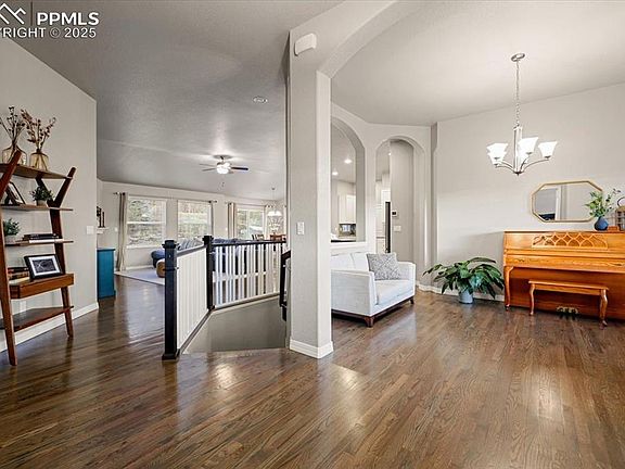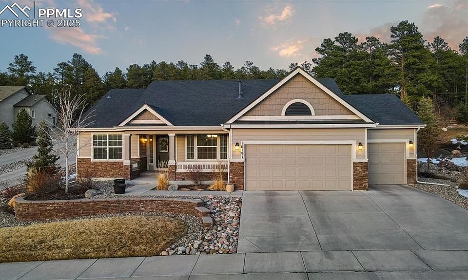 Colorado Ranch Living at its Finest Welcome to this exceptional ranch home in Promontory Pointe, where quality residences rarely become available. This stunning single-level retreat offers the perfect blend of luxury and comfort with 5 spacious bedrooms and 3 well-appointed bathrooms across a thoughtfully designed floor plan. The 3-car garage provides ample space for vehicles and storage, enhancing the home's functionality. Step inside to discover gleaming wood floors throughout the main level, adding warmth and elegance to the inviting great room with its cozy gas fireplace. The open concept flows seamlessly into a gourmet kitchen equipped with high-end appliances, including a premium gas range and quality dishwasher. Whether hosting formal gatherings in the dining room or enjoying casual meals in the breakfast nook, this home accommodates any occasion. The luxurious primary suite offers a private sanctuary with a spa-inspired bathroom and generous walk-in closet. A convenient second bedroom on the main level is ideal for guests or a home office. The finished lower level hosts three additional bedrooms and a full bathroom, creating the perfect space for family members or visitors. Enjoy breathtaking mountain views from your covered front porch, while the backyard borders serene wooded open space, providing privacy and natural beauty. This unique setting creates the perfect backdrop for outdoor living and entertaining. Located on a peaceful street with sidewalks, this home offers the best of Monument living - minutes from parks, excellent District 38 schools, convenient shopping, and easy access to I-25 for commuting to Denver or Colorado Springs. Don't miss this rare opportunity to own in highly desirable Promontory Pointe, where quality homes are coveted and opportunities limited