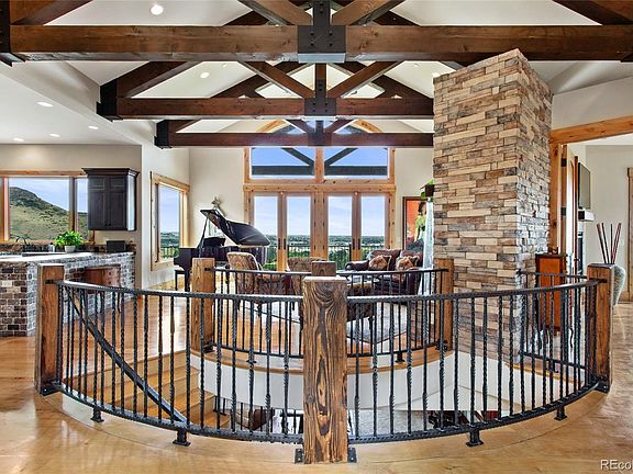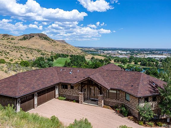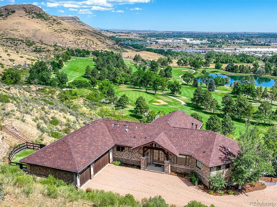 Nestled between Golden's South Table Mtn and The Club at Rolling Hills, this beautiful rustic contemporary home is waiting for you. The 1.27 acres of building envelope and 61.33 acres of conservatory land adjoins over 1,500 acres of Open Space, a championship golf course and private club. The panoramic views of the mountains, golf course, city lights and skylines make it one of a kind. Be welcomed home as you drive up the gated entrance to the front entry. The open floor plan is flawless with exposed beam ceilings and thick maple hardwood flooring throughout the majority of the main level. Featuring an oversized living room, an optimally designed kitchen and dining area, two offices, and primary suite, the main level has it all. The large windows and french doors provide plenty of natural light and stunning views of the golf course, surrounding foothills, and endless city lights. The main-floor primary suite features deck access overlooking the golf course and views of the Denver skyline along with a 4-piece primary bath, fireplace, and oversized walk-in closet. The 3-car garage is accessible to a fenced-in yard. The mudroom adjacent to the garage leads to an open kitchen and dining area with large windows throughout, custom cabinetry, granite countertops and a walk-in pantry. A spacious laundry room off of the mudroom features an industrial grade stainless steel sink, built-ins and a bathroom. A curved staircase leads to the lower level. The main sitting area includes built-in surround sound, a fireplace and sliding doors to a covered deck with dramatic mountain and golf course views. French doors lead to a fitness area with a walk-in steam room and shower. Off of the main area is a wet bar, guest bedroom with a full bath and a mother-in-law suite complete with a bedroom, 3/4 bath and kitchenette. There is radiant heat throughout the house and garage. While at the doorstep of downtown Golden and Denver, you can experience the serene privacy of a mountain getaway.