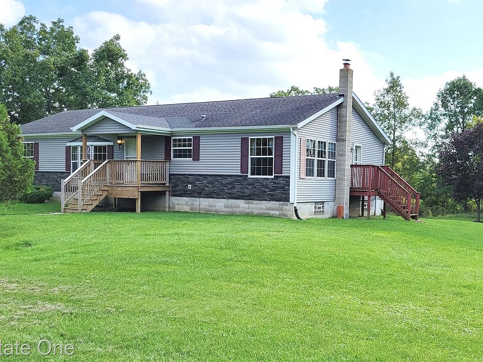 COUNTRY SECLUSION: Spacious 3 bedroom/2 bath, ranch style home with full 10 block walk-out/daylight basement with supplemental wood burning stove. Beautiful island kitchen with lots of cabinets & counter space. Bay windowed living room. Formal dining room, first floor & basement laundries. The primary bedroom features a walk in closet, private 4 fixture bath. 2 porches & 12x16' deck. Home is well set back...has beautiful rolling lawn area, west & south end of property is treed. 30x40' pole barn built was in 2007, wired & windowed. Quiet location, farm and homes on acreage, almost no traffic. Upgraded insulation, windows, cabinetry , & drywall though out.