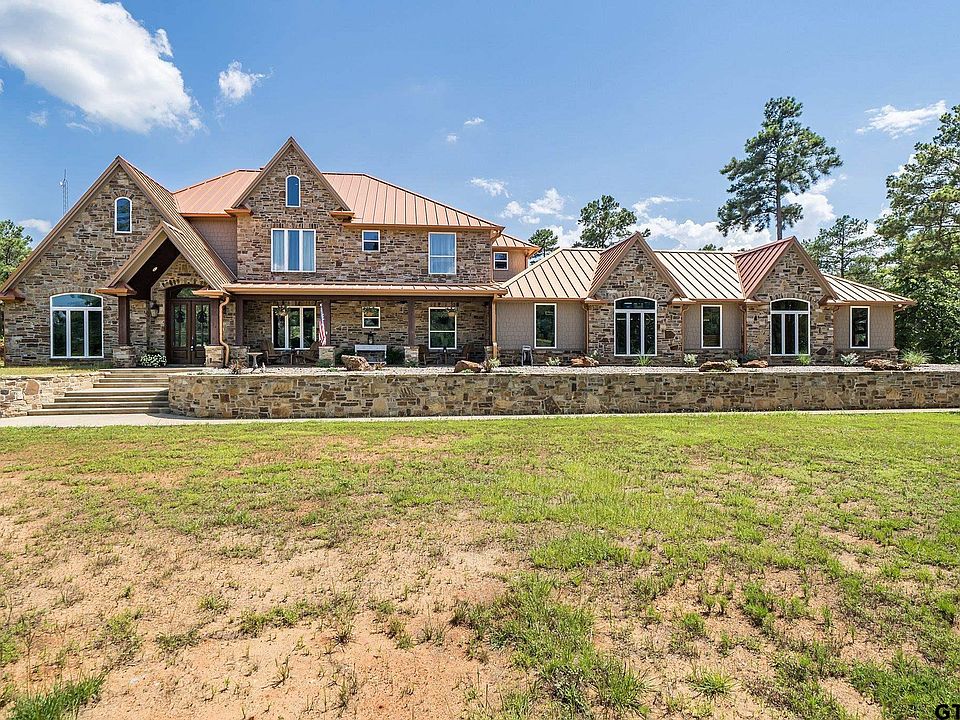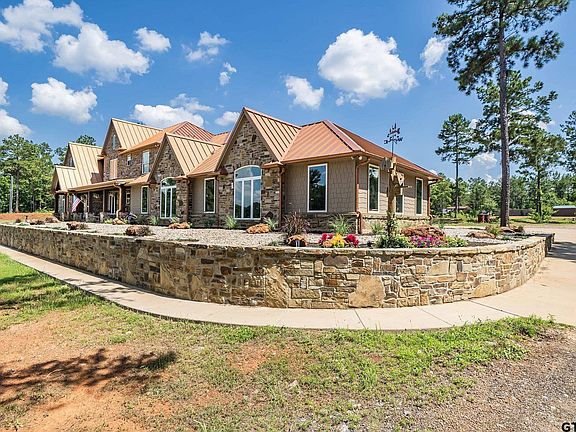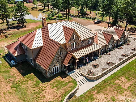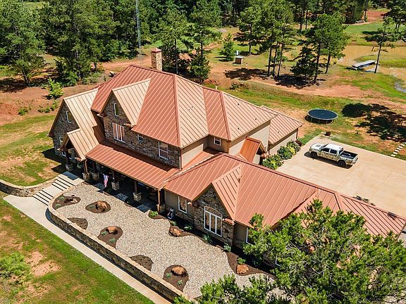 Gorgeous custom home with 6 bedrooms, 5 bathrooms, and a 4 car garage on over 44 acres in Flint! Located close to Lake Palestine, this home, built in 2016, has over 5700 square feet and something for everyone! The foyer with flanking formal dining room and media room with surround sound leads you into the family room with soaring 22 ft ceilings, a wall of windows, and a floor to ceiling masonry stone fireplace with 48" opening. This opens directly into the kitchen with generous breakfast bar/island, commercial grade stove, copper apron front sink, large pantry, granite countertops, and glass tile backsplash. The den/man cave, equipped with wet bar, ice maker, and beverage refrigerator, offers plenty of room to watch the game or just enjoy the space. Opposite the kitchen is the wine room with a wine fridge and plenty of storage. The split master suite with sitting area, walk-in closet with washer and dryer hook-ups, and ensuite bath is truly a retreat and is appointed with separate vanities, separate tub and oversized shower with multiple shower heads, and granite countertops. Downstairs you will also find one guest room with ensuite bath. Upstairs are 4 bedrooms--2 share a Jack and Jill bath, while the other 2 have ensuite baths...one even has a W/D hookup! Some of the home's amenities are 2 tankless water heaters, foam insulation, 22 KW Eaton generator, large porches, 6000 psi slab foundation with hardy cement siding/exterior, and standing seam class 4 impact resistant metal roof. In addition, the 4 car garage has 2 storage closets and stairs to a very large attic storage space! Some of the features of the land include 4 ponds (2 stocked and 2 ready for expansion), 230 ft. water well with electric pump (for irrigation and pond maintenance), 2 electric services, 100'X100' privacy fence livestock enclosure with shed (electric and water), carport for equipment, RV hookups with water and electric with separate septic system, plus deer blinds and lots of deer