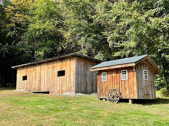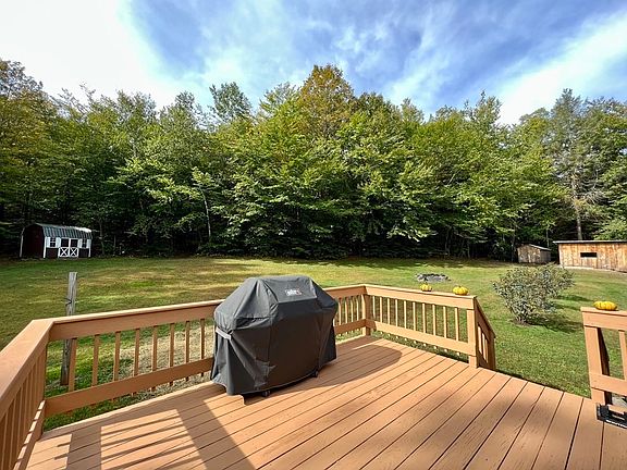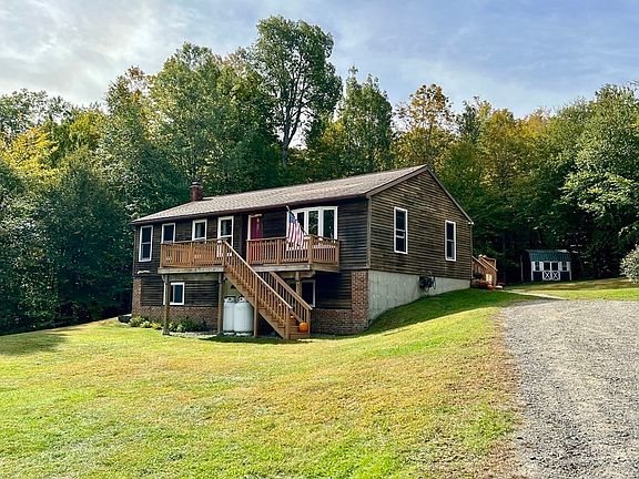 Well maintained and charming Ranch style home on 9 acres perfectly sited on top of a knoll and surrounded by open land and mixed woods. Plenty of room for gardens, a great spot for pets and there are walking trails that meander throughout the woods. It comes with a garden shed, enclosed large shed and a sweet chicken coop with electricity and lights! The interior of the home features an open kitchen, dining and living area with sliding glass doors to back deck. The main bedroom has its own private full bath and there are 2 additional bedrooms and a second full bath. The bonus is the finished walk-out basement that has recreation room complete with a dry bar with a gorgeous handmade wood countertop. It also has a large fourth bedroom with lots of closets and a utility room with builtin woodwork benches. In addition it has central air conditioning and propane hot air heat. This special property is in a beautiful setting and one you would love to call home!