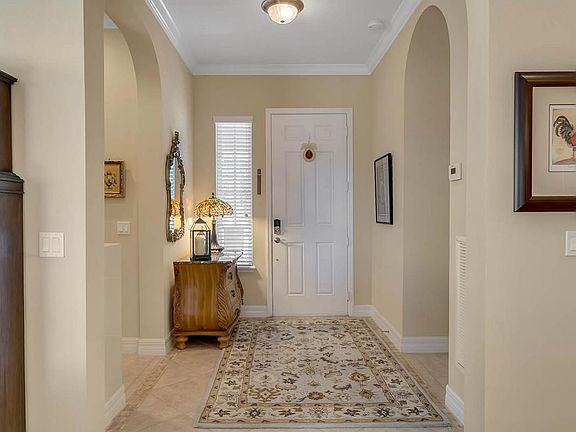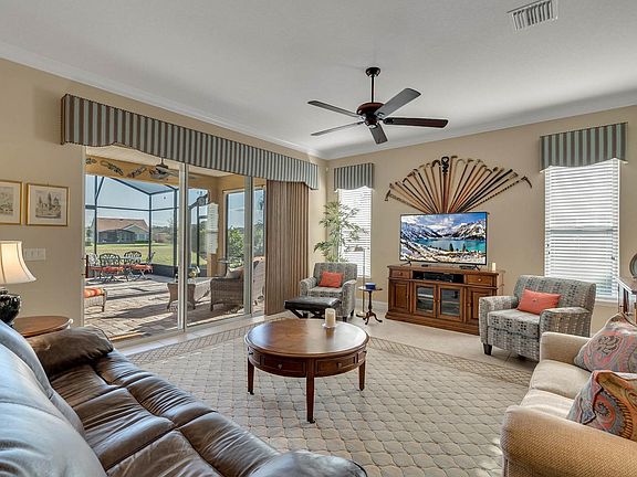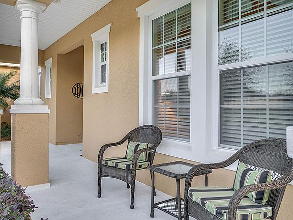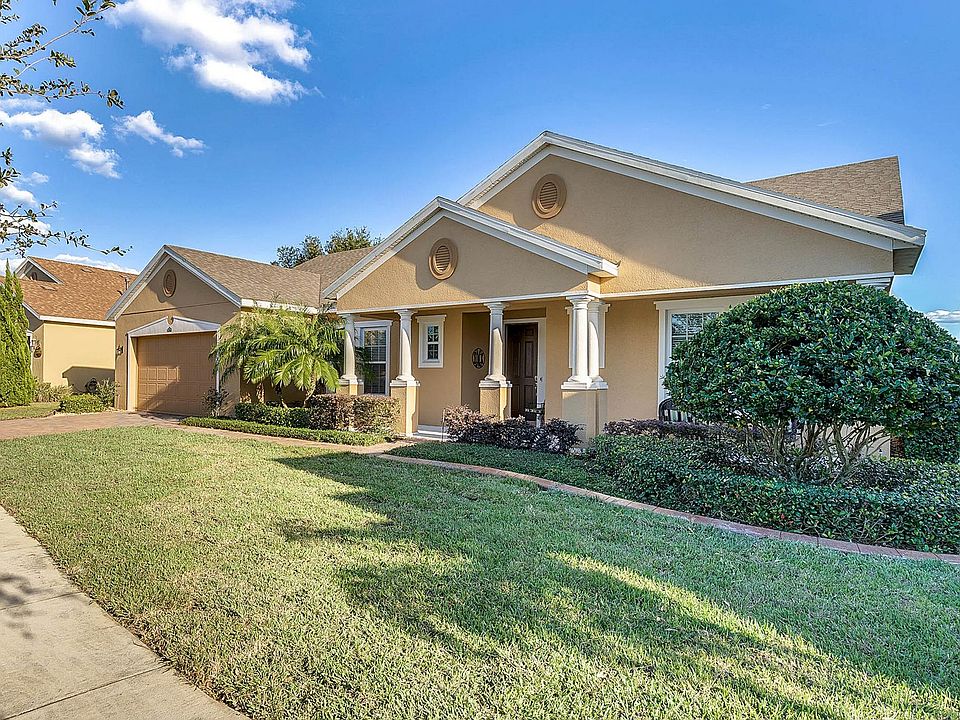 **Virtual Tour Available** Welcome home! You've found your perfect retreat for an easy lifestyle with this home in Trilogy Orlando, a beautiful 55+ active community. This full solar home keeps energy costs to a minimum. The charming front porch draws you to the home, and you'll find a warm welcome as you enter the foyer. The open floor plan offers a dedicated dining space, a living room, and a beautiful kitchen featuring granite counter tops and an oversized island. The kitchen boasts Jenn-Air stainless steel appliances, a tile backsplash, a large walk-in pantry, cabinets with crown molding, and a built-in wine rack. Around the corner from the kitchen is the separate upgraded smart space which gives plenty of room for laundry, a utility sink, a drop space when entering from garage, and lots of counter and cabinet storage space for hobbies or for use as a second office. In the master suite, you'll find plenty of space for a large bedroom set, floor-to-ceiling storage in the large walk-in closet, a private office with plentiful workspace and storage, and a master bathroom with double vanities, a granite counter top, a garden tub and separate shower with a frameless glass enclosure. The 2nd and 3rd bedrooms each have a full bathroom, with one of them being a true en-suite with a walk-in closet. Crown molding is featured throughout the house. The living room, lanai, and all bedrooms have ceiling fans. Gain access to the beautiful backyard through either of the two sets of triple slider glass doors that open to the lanai and lead into a 30' by 15' domed screened porch and enjoy the conservation view. The exterior of the home was professionally painted in 2020, and the garage was refreshed with additional lighting and a beautifully finished floor. The Trilogy Orlando HOA dues include the guarded gate, Spectrum cable and internet, home security system, lawn care/landscape maintenance, and access to Trilogy's 57,000 sqft community center. Amenities include a restaurant/bar, a fitness center, resort-style indoor/outdoor pool, hot tubs, bocce ball, basketball, pickle ball, tennis, golf simulator, fitness classes, card room, and many other classes and activities. Well-maintained streets and sidewalks offer a great environment for an active lifestyle. Come live the good life! Schedule your showing today!