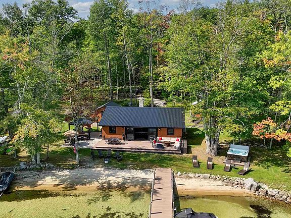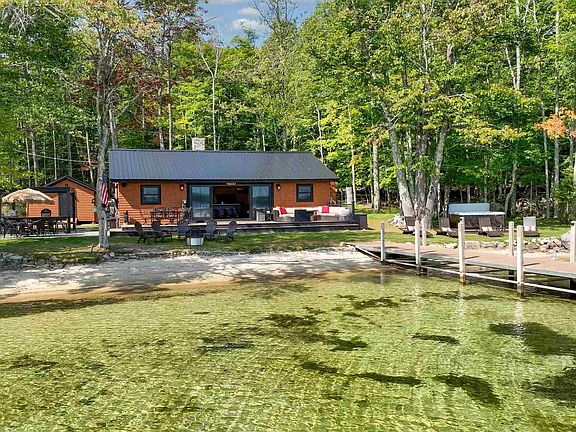 Experience resort-like living with this exceptional 3 bed 1.5 bath custom renovated ranch situated just 30' from water's edge with 165' of waterfront, and an oversized composite wrap-around deck. Renovation to studs completed in 2021 included new plumbing and 200 amp electric, with high-end finishes typically found in mainland properties. A custom designed kitchen with leathered granite and oversized island has $40k in premium kitchen appliances including Wolf, Subzero, Asko, and XO. Maibec pre-treated cedar shakes and a metal roof along with Marvin doors and windows including a 16' panel slider take advantage of the fabulous views. Inside find 5 zone Mitsubishi mini splits for heat and a/c, an expanded custom main bathroom, a jack and jill bath between the spare bedrooms. a cathedral ceiling and 2 oversized lofts for expanded sleeping space. The walls and ceilings are insulated and finished with tongue and groove planks. There are custom blinds throughout the house, motorized at the slider and kitchen sink. The 75' seasonal U shaped dock has composite decking matching the house and space for multiple boats and jet skis. Enjoy the beautiful, expansive sugar sand beaches on either side of the dock. A new $35k custom outdoor kitchen was installed in 2024 under cover of the 12x15 louvered pergola with motorized roof panels. The 16x16 bunkhouse is finished to the same quality and detail as the main house. There is a custom 12x20 shed with a workshop and inside & out storage.