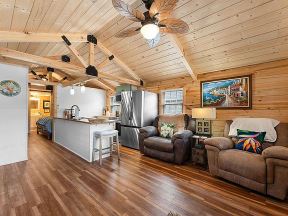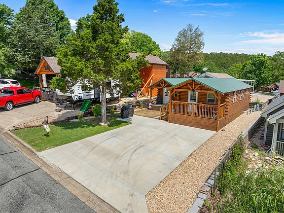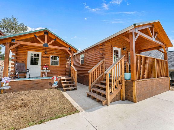 Discover an extraordinary opportunity in the sought-after 55+ Community of Wilderness Club RV Resort in Hollister, MO! For the first time on the market, this stunning property offers not one, but two charming cabins! The main cabin, a cozy 588 sqft retreat, serves as the owner's residence. Step inside from the inviting front porch, and you'll be greeted by breathtaking Ozark views. This chic cabin features luxurious vinyl flooring, contemporary fixtures, and a show-stopping 10-foot butcher block island. The kitchen is equipped with top-of-the-line appliances, and the open living area includes a stylish half bath for guests. A sliding barn door leads to the bedroom, which boasts a massive primary closet and a full bathroom with a walk-in shower.The second cabin, a versatile 360 sqft space, is currently used as an office, laundry room, and storage area. It comes complete with a covered front porch, electricity, plumbing, a window unit for cooling, and floor-to-ceiling storage. Both cabins were crafted by skilled Amish craftsmen and feature solar blocker windows, durable metal roofs, and convenient RV hookups. You'll be captivated by this property as soon as you pull into the oversized driveway. The monthly HOA charge of $60 covers various amenities such as yard mowing, trash removal, locked mailboxes, and an RV/Boat storage area. The community center offers a range of fabulous facilities including a library, pool, grilling area, laundry, showers, a fully equipped kitchen, and bathrooms. Located just minutes away from Branson Landing, shopping, shows, and the Table Rock Dam, this neighborhood truly has it all! Don't miss the opportunity to enjoy the best of both worlds in this peaceful and welcoming 55+ community at Wilderness Club RV Resort. For more information about the community and to review their bylaws and restrictions, visit their website at www.wcrvr.com. Sqft total, is for both cabins. Call today for your private showing.