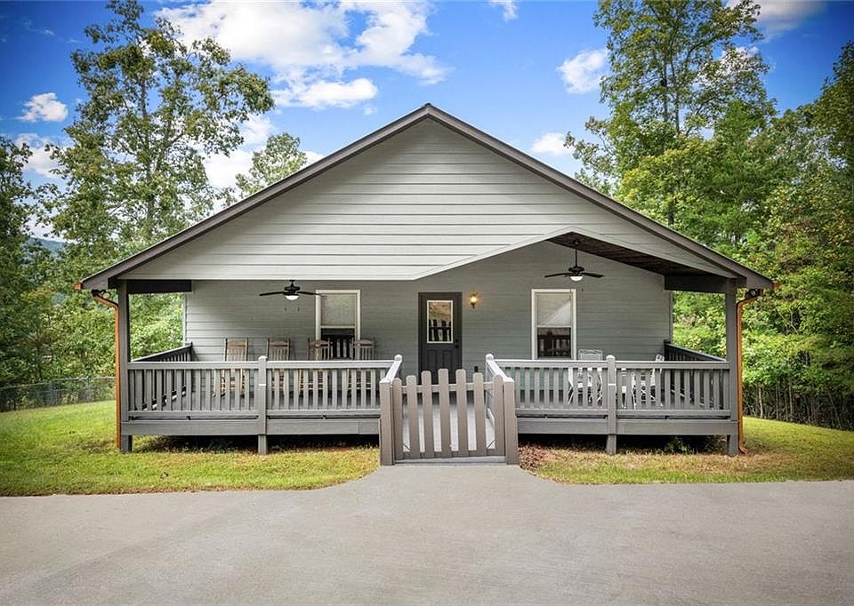 Discover your own slice of mountain paradise in this charming 3-bedroom, 2-bath cabin-style home, perfectly situated on 1.8 serene acres with sweeping long-range mountain views. Offering 1,591 square feet of comfortable living space, this single-level ranch home blends rustic warmth with modern conveniences. Step inside to an inviting open floor plan filled with natural light streaming through large windows. Gorgeous wood floors flow throughout, complementing the soaring ceilings in the great room. The kitchen is a chef’s delight, featuring granite countertops, a spacious island, stainless steel appliances, pantry area and an adjoining breakfast area ideal for casual meals or entertaining. The oversized primary suite boasts a walk-in closet and a large bath, while two additional bedrooms and a second full bath provide space for family or guests. Both bathrooms are generously sized, offering comfort and functionality. Outdoor living is equally impressive: relax on the expansive front porch in a rocking chair with your morning coffee, unwind on the back deck while soaking in the expansive mountain views, or enjoy the level, fenced backyard—perfect for pets or gardening. The detached two-car garage offers ample parking and storage, and there’s plenty of extra space for visitors or recreational vehicles. Recent updates include new low-maintenance HardiPlank siding, copper gutters with guards, and fresh exterior paint on both the home and garage, ensuring years of worry-free living. With no HOA, tons of privacy, and close proximity to downtown Blue Ridge, Blairsville, and Lake Nottely, hiking, fishing, camping, kayaking and national forest this property is the perfect blend of tranquility and convenience. Whether you’re looking for a full-time residence, vacation getaway, or short-term rental opportunity, this mountain retreat is ready to welcome you home. Riding mower, push mower, washing machine & dryer to convey with the home.