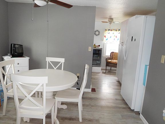 This updated 2 bedroom single wide mobile home has a new kitchen with gas stove, open livingroom/diningroom area, updated bath and large primary bedroom. New drilled well installed in 2022, enclosed entry, horseshoe driveway for easy access and newly fenced in backyard with firepit. Several storage units on 1.14 acres with 2 units having electrical power and currently used as a workshop. Economical to heat with 2 monitors and a 2019 hot air furnace.