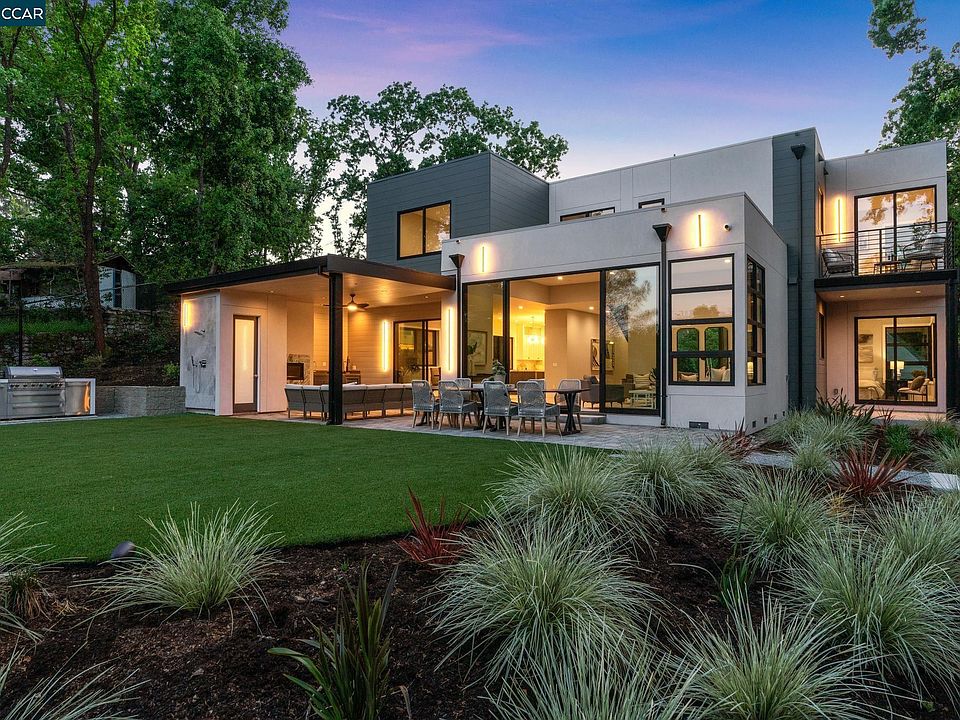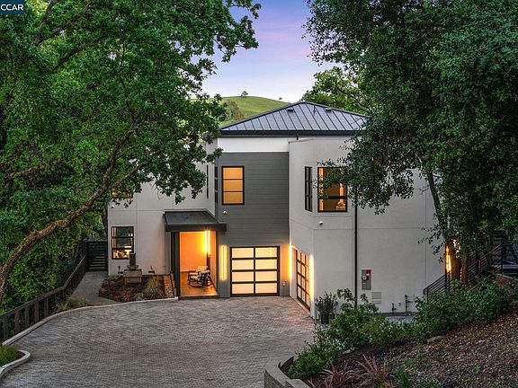 Nestled in a cozy knoll in the coveted West side of Alamo, you'll find this spectacular modern new construction property with owned solar. High-end luxury finishes and excellent floorplan with walls of glass that bring the outdoors in. Chef’s kitchen with Thermador appliances, huge center island, double ovens and two refrigerators and freezers. Great open floorplan with seamless flow from TV room to kitchen to living/dining areas to the beautiful back yard loggia, outdoor dining area, fire pit, hot-tub and expansive lawn. Fabulous for entertaining! You’ll have your choice of primary bedrooms either upstairs or on the main level. All bedrooms are outfitted with well-appointed ensuite baths and walk-in closets. An added bonus, an au-pair/in-law apartment with its own kitchenette, living/dining room and washer/dryer. The cherry on top… direct access to the Ironhorse Trail!