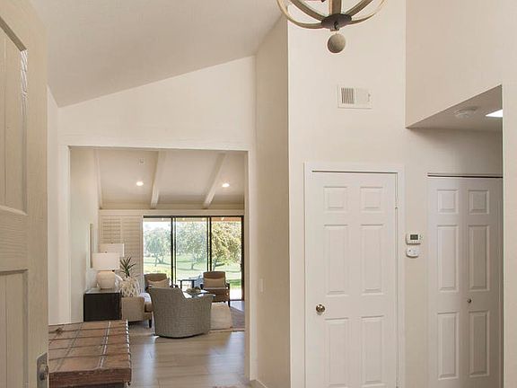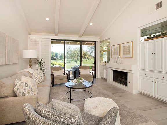 Gorgeous, beautifully maintained Durango plan! Massive double fairway views offering sunny mornings (east exposure) on the patio, privacy and common area pool and spa right across the street! Quiet street, ample parking and great evening views of the clubhouse. Home has high, beamed ceilings, and a clean, neutral decor palette. Features included updated kitchen with stainless appliances, stunning, oversized tile flooring and a nicely landscaped entry courtyard.