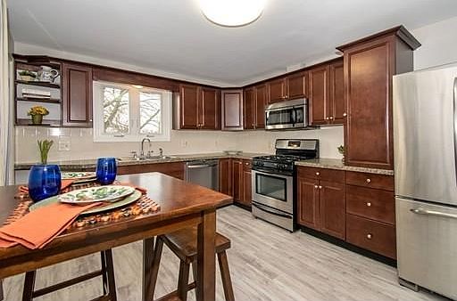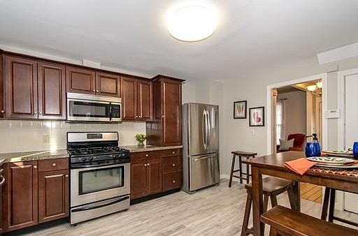Wow! This Fantastic home is just a Creme Puff.. Completely remodeled throughout, this home is turn key! First floor features an eat-in kitchen highlighting stainless steel appliances & cherry stained cabinetry opening to an airy sized living rm/ dining rm combo featuring beautifully refinished wide plank pine floors & 9 ft ceilings along w/ updated half bath. Second floor highlights master bdrm w/ his & her closets, updated full bath w/ walk in closet & linen closet, a nice amenity. A bright & spacious flex rm with the potential of a fourth bdrm or family offering newer carpeting awaits you! Third floor features two additional adorable bedrooms w/ newer carpeting. Outdoor entertaining begins here w/ a 14 x 16 deck dining area off the kitchen area, fully fenced in flat backyard a nice bonus! Seller states upgrades include: Newer carpeting/vinyl (2018), chimney repair (2018), hot water tank (2010) electrical panel (2018), interior freshly painted throughout (2018). A MUST SEE!