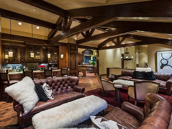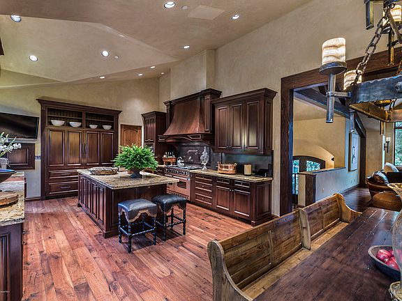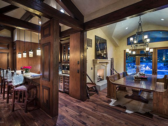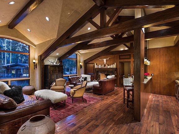 This exclusive Red Mountain estate is situated on a wooded nature wonderland in one of Aspen's most prestigious locations. Once you pass through the private gates, this one-of-a-kind retreat offers the best in privacy, seclusion and mountain living complete with spectacular architecture, waterfalls, streams and ponds, outdoor dining and seating areas including a romantic gazebo, an infinity hot tub, not to mention a zip line and nature trail. This beautiful home features a spacious gourmet kitchen, bar, living room with wood burning fireplace, movie theater, sitting room, wine room and exercise room equipped with a treadmill, elliptical climber, weight machine and free weights. The main level Master Suite and Guest Master Suite are both complete with a gas fireplace, en-suite bathroom