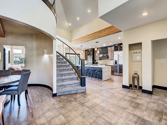 The main level is designed as a complete living experience and is centered around a curved staircase with mezzanine overlook that establishes visual connection between levels and creates open sightlines throughout the main living space. The kitchen features a waterfall concrete island, custom cabinetry, and an open layout connecting seamlessly to the dining and living areas. A mosaic-tiled sunroom extends the living space and provides a light-filled area with mountain views.