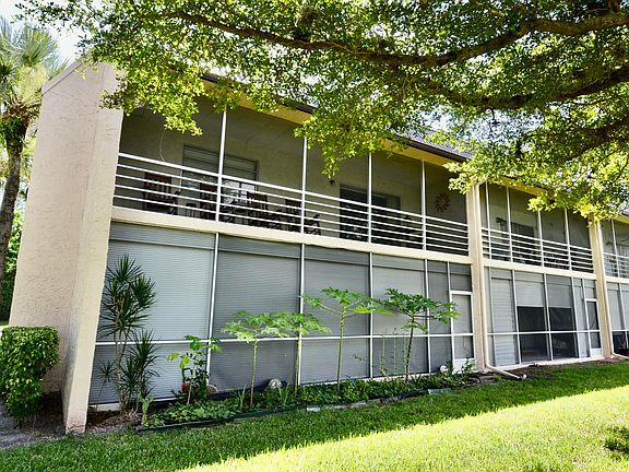 Immaculate and beautifully maintained 2 bedroom 2 bath end unit. Hardwood and ceramic tile throughout. Custom high baseboards, waik-in closets in both bedrooms. Walk-in storage closet. Huge screened-in patio overlooking view of one of the pools. Close to shopping. Minutes from turnpike. HOA includes 24- hour manned-gate, exterior insurance, lawn care, cable, internet, water, trash & recycle pickup, on site ofice, cafe, community heated pools, spa, billiards, sauna, library, tennis, shuffleboard, game room, gym, curtesy bus, group events throughout the year. Quick possession. Easy to show. Very quiet neighborhood. Pet friendly with restrictions. Brand new A.C (2022) End unit with more windows.