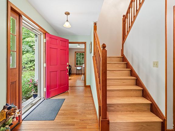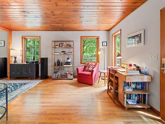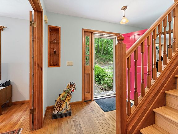 Don't miss this beautiful Colonial on over 8 private acres! As you enter the home it has a side stair case not your typical Colonial. You can go to the right & through the glass french doors is a 1st floor den/formal dining rm. To the left, you go into the massive living room allowing two separate spaces for entertaining. The hardwood floors & the wood ceiling give you the feel of a cozy cabin in the woods. Off of the living rm is the eat in area complete w/ ceramic wood stove w/ brick wall, this opens to the beautiful Country kitchen, w/ two toned cabinets, solid surface counters and a large prep island complete w/a 2nd sink this kitchen also offers newer SS appliances, & a farm house sink w/ a window overlooking the property, off the Kitchen is the first floor laundry and half bath and access to the garage. The second floor has new hardwood stairs & flooring, the 3 bedrooms, including a primary w/ensuite & another full bath complete this flr. The LL has a fam rm, storage, workshop.