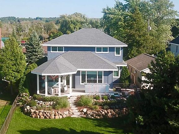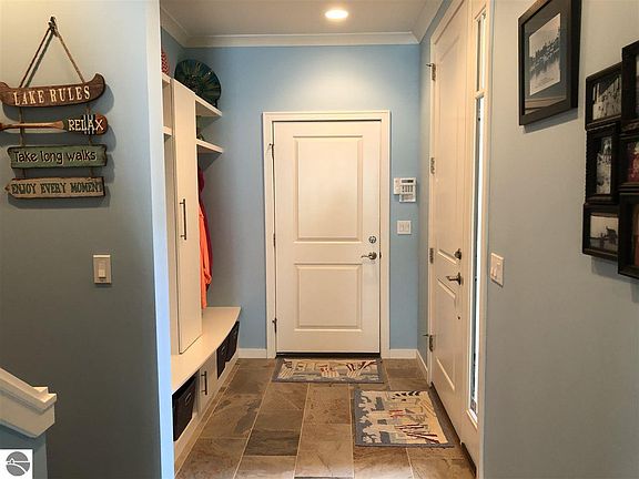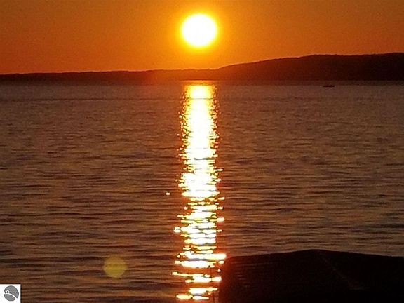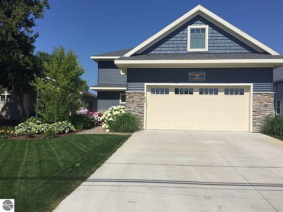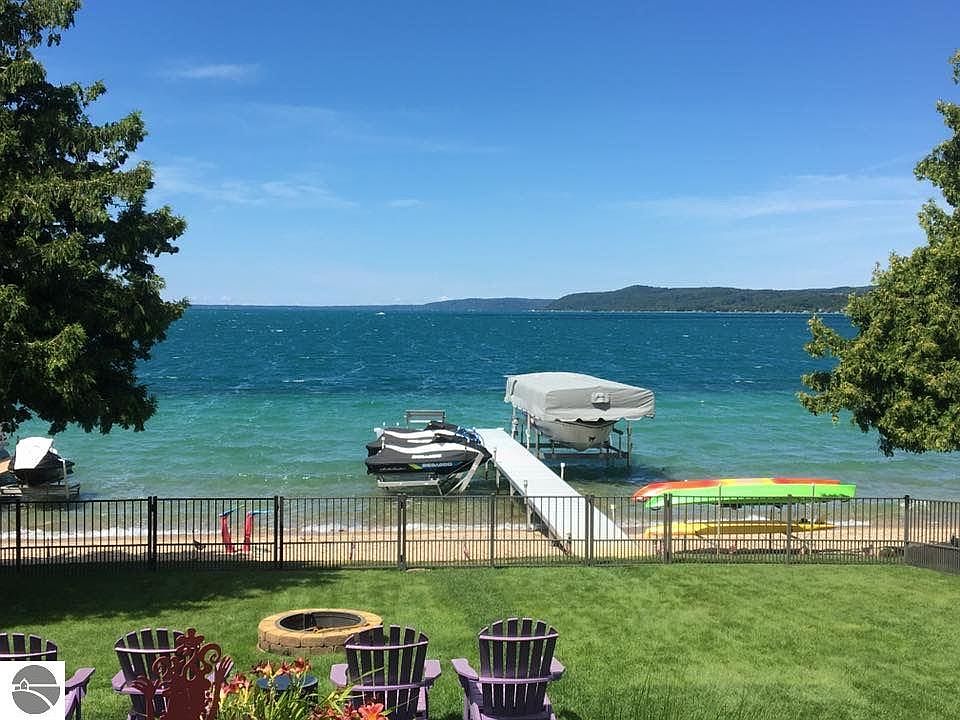 Beautiful architectually designed and spacious year around home is located on Crystal Lake's great sandy beach in Beulah. Gorgeous sunsets and views of the lake are always special. Easy walk to town. Landscaped, great easy care deck, the dock and boats are a short distance from the house. Lovely entry way leads to the living room with a fireplace, high ceilings, dining and kitchen areas blended for easy living. Two of the four bedrooms are en suite, the master bedroom is on the main floor with lake views. Ceiling fans in all of the bedrooms. Three full baths, one guest half bath off the entry way. Efficient laundry room with sink. Lots of storage spaces, cupboards, closets and an attic over the garage, important for year around use.
