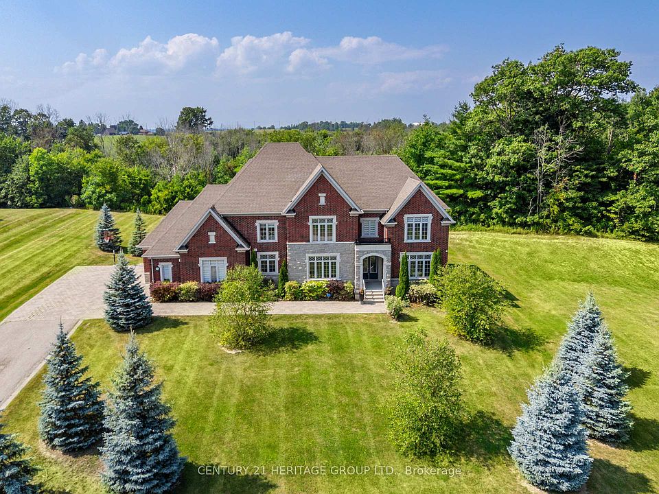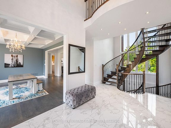 Majestically set in prestigious The Shires Estates of Bradford, this elegant 3-car garage estate offers 4,236 sq. ft. above grade plus a finished basement on a premium 1.73-acre landscaped lot backing to a ravine. 10-ft ceilings on the main floor, 9-ft on the second floor, and 9-ft in the basement enhance the scale and light. The grand spiral staircase with dark-stained hardwood and wrought-iron spindles rises beneath a soaring double-height window in the foyer. The entertainers kitchen boasts dual oversized islands one with undermount sink, quartz prep counter, and pull-down faucet, the other with leathered granite for dining plus a 48 JennAir professional gas cooktop with griddle and brass pot filler, custom wood hood, Monogram double wall ovens, two integrated dishwashers, built-in wine cooler, quartz waterfall counters, full-height slab backsplash, crown-topped shaker cabinetry, glass-front uppers, and statement pendant lighting. Main floor highlights: bedroom with corner windows; private office with glass doors, crown moulding, and chandelier; great room with tray coffered ceiling, custom built-ins, gas fireplace, and oversized windows with forest views. Upper level: Two primary suites, 2 bedrooms with walk-in closets and 4-pc ensuites. One of the primary suites offers tray ceilings, two closets, and a spa 5-pc ensuite with soaker tub, glass shower, dual vanity, and private water closet. Backyard retreat: 30x12 pergola, 34x30 stone patio, stone pillars, and mature forest backdrop. Basement (~1,700 sq. ft. finished): home theatre, custom wet bar with quartz island & sink rough-in, electric fireplace, modern 4-pc bath, recreation area, climbing wall, sport/multi-use room, gym, elegant staircase, large storage, 200-amp service. Driveway fits 15+ cars. Close to shopping, dining, parks, schools, golf & Hwy 400.