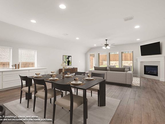 Wood mantel fireplaceCovered backyard patioTwo-car garageWall of windowsDining areaFamily roomOpen kitchen