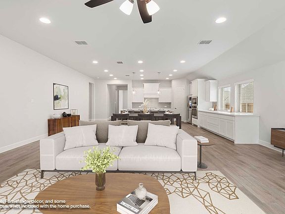 Home office with French doors set at entry with 12-foot ceiling. Extended entry leads to open kitchen, dining area and family room. Kitchen features corner walk-in pantry, generous counter space and island with built-in seating space. Dining area flows into family room with a wood mantel fireplace and wall of windows. Primary suite includes double-door entry to primary bath with dual vanities, garden tub, separate glass-enclosed shower and two large walk-in closets. A guest suite with private bath adds to this spacious one-story home. Covered backyard patio. Mud room off two-car garage.
