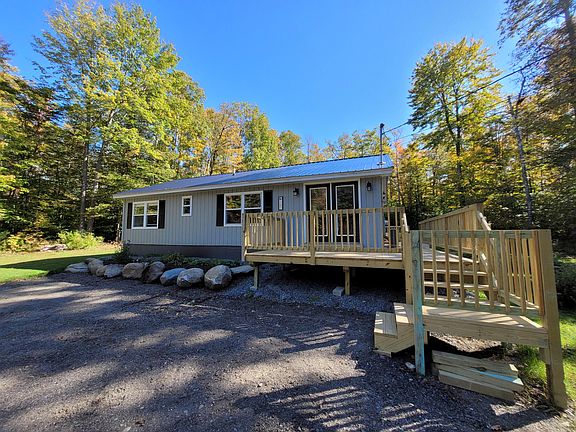 All 1 floor living at is best! Fully updated Ranch style 2 BR 1 1/2 Bath home has been fully gone thru and sits on private treed 3 acre Lot with newly installed reclaimed driveway, wrap around deck and whole house generator. The kitchen cabinets and countertops are all new, stainless fridge, stove and dishwasher for modern appeal. Heats super efficiently with furnace or use Fujitsu heat pump and have bonus of Air conditioning in warm months. Master bedroom has own bath and walk in closet. Larger then normal lot includes garden shed and private backyard with firepit. Owner just finishing final details so come see right away and arrange to sip your coffee on your private treed back deck or by the stone backyard firepit!