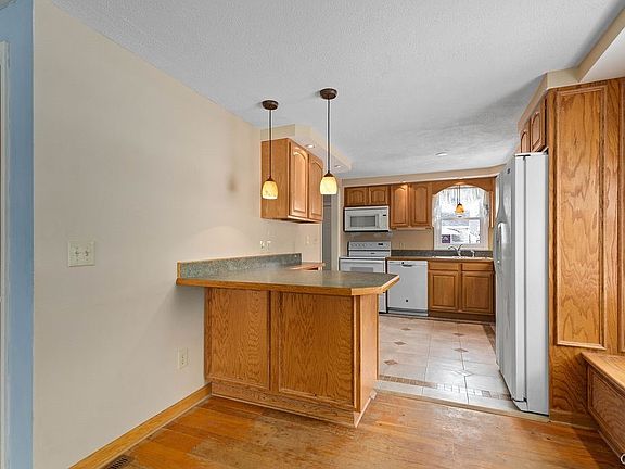 Welcome home to this charming Cape Cod that is move in ready! Bright updated eat-in kitchen with oak cabinets and tiled flooring. The appliances include a dishwasher and garbage disposal (approximately 1 year) newly installed refrigerator and a microwave that is above the stove. The breakfast bar opens to the dining/living room and makes a great entertaining space! The dining/living room is carpeted but hardwood floors can be seen when lifting up corner of carpet. The first floor has a bedroom suite with full bath. There is also a second full bath on first floor. Additional bedroom has been converted to a formal dining room with hardwood floors and sliding glass door that overlooks deck and partially fenced in back yard with shed. The stackable washer and dryer is located on the first floor and there are additional laundry hookups in the lower level. The second level has a large bedroom with an additional bonus space with closet and storage. Many windows have been updated and the furnace is approximately 5 years old. Great location close to shopping, restaurants and highways! 2022-02-23